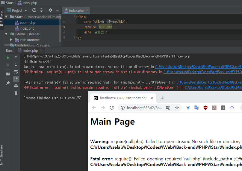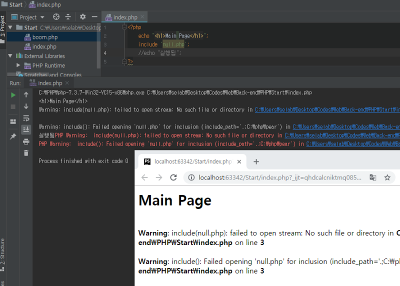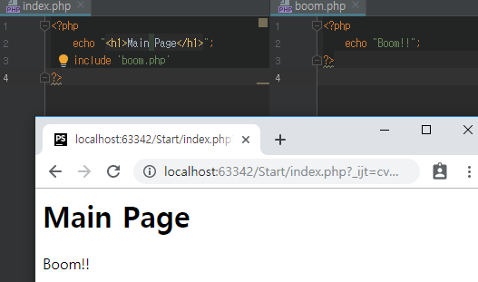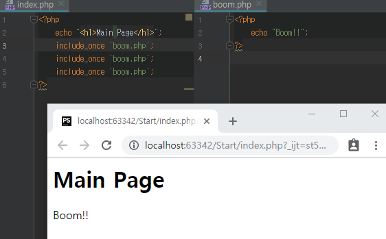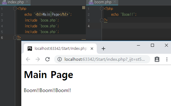 ์๋ ์ฝ๋๋ index.php๋ฅผ ์คํํ์ผ๋, includeํ boom.php๊น์ง๋ ํจ๊ป ์คํ๋๋ค.