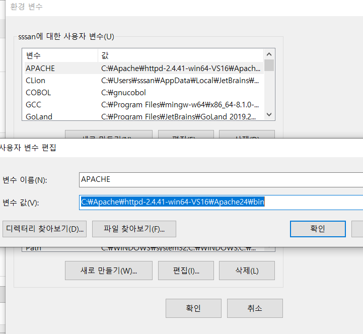 ๊ทธ๋ฆฌ๊ณ , ์๊น์ฒ๋ผ ํธํ๊ฒ ์คํ์ ํ ์ ์๋๋ก ํ๊ธฐ ์ํด, httpd๊ฐ ์๋ ๊ฒฝ๋ก๋ฅผ ํ๊ฒฝ๋ณ์์ ์ถ๊ฐํด์ค๋ค.