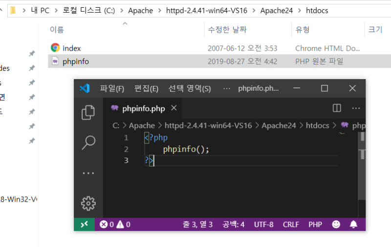 ์ํ์น ํด๋์ ์๋ธํด๋ htdoc์ php ๋ฒ์ ํ์ธ์ฉ์ผ๋ก phpinfo๋ผ๋ ์ฝ๋๋ฅผ ์์ฑ. ์๋์ ๊ฐ์ด ์จ์ฃผ์