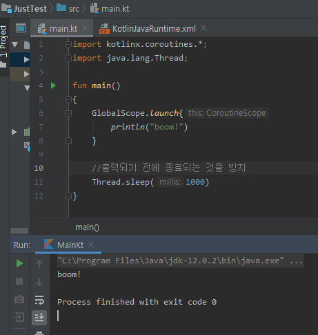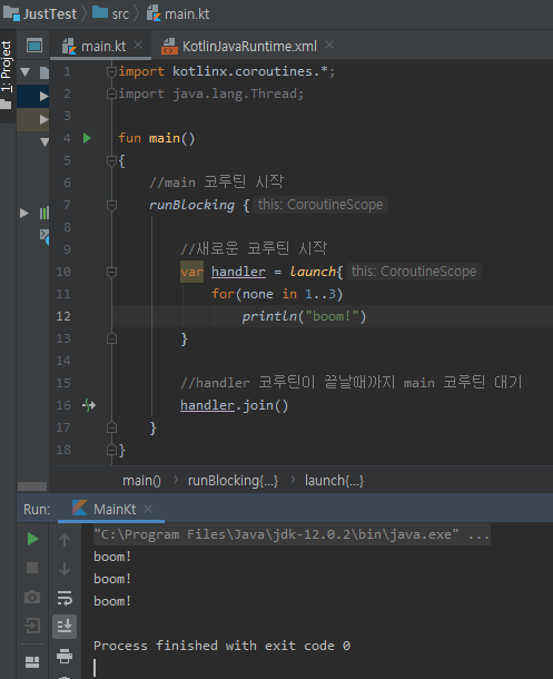 하지만 기본 main 문에서는 그런식의 사용이 불가능하기 때문에, runBlocking 함수로 메인 코루틴 블럭을 따로 표시해준다.