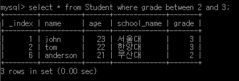 ์๋ ์ฟผ๋ฆฌ๋ 2<= x <=3 ๋ฒ์์ grade๋ง์ ์ถ์ถํ๋ค.