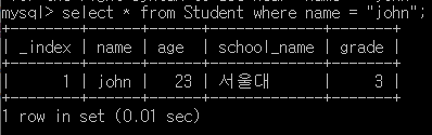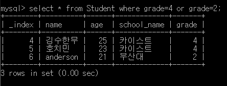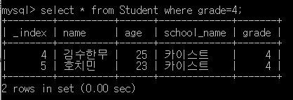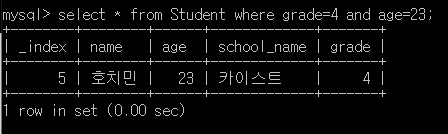 ๋ฐ๋ผ์ ์๋ ์ฟผ๋ฆฌ๋ grade๊ฐ 4์ด๋ฉด์ age๊ฐ 23์ธ ํํ๋ง ์ฐพ๋๋ค.