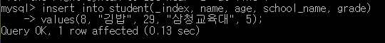 insert into ํ ์ด๋ธ๋ช (์์ฑ๋ช 1, ์์ฑ๋ช 2, ...) values(๊ฐ1, ๊ฐ2, ...);