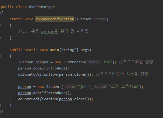 doSome 메서드에선 프로토타입의 복사본을 갖다가, 다른 곳에 저장하든지, 수정해서 뭘 하든 다 할 수 있다 가정한다.