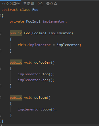 여튼 브릿지 패턴에서 주가 되는 클래스는, 구현 클래스에 대한 인터페이스를 갖는다. 그리고 주요 구현부를 구현 클래스에 위임한다.
