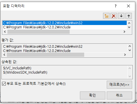 현재 사용중인 자바 버전의 include, include/win32 폴더를 포함한다.