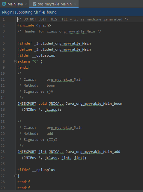 자바에 맞는 헤더파일을 만들어야 하는데, 그에 앞서 먼저 자바에서 프로토타입을 선언해줘야 한다.