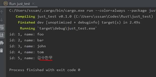์ด๋ฌ๋ฉด ์ฒซ๋ฒ์งธ ์ปฌ๋ผ์ ๊ฐ์ i32๋ก ์ ์ฅ, ๋๋ฒ์งธ ์ปฌ๋ผ์ String์ผ๋ก ๋ฐ์์์ ์ ์ถ๋ ฅํ๊ฒ ๋๋ค.