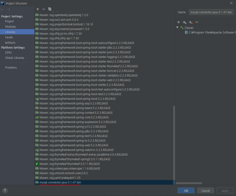 ๊ทธ๋ฆฌ๊ณ ์ฌ์ฉํ ๋ฐ์ดํฐ๋ฒ ์ด์ค์ ์ปค๋ฅํฐ๋ฅผ ๋ผ์ด๋ธ๋ฌ๋ฆฌ๋ก ๋ฑ๋กํด์ค๋ค. ๋ jar์ ๋ฐ์์ ์ง์ด๋ฃ์๋ค.