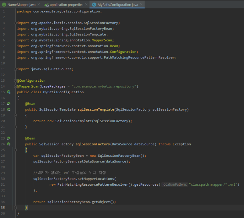 ๋ง์ด๋ฐํฐ์ค๋ ์ฟผ๋ฆฌ๋ฅผ ์คํํ๊ธฐ ์ํด์ SqlSession์ด๋ ๊ฐ์ฒด๋ฅผ ์ฌ์ฉํ๋๋ฐ, ๊ทธ๊ฑธ ์ค์ ํด์ฃผ๋ ๊ฑฐ๋ค.