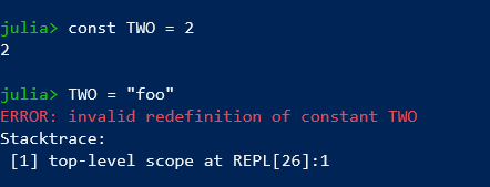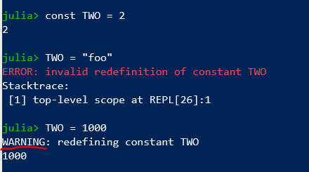 줄리아는 다른 동적 언어들과 좀 다르게, 변경시킬 수 없는 상수의 선언 기능도 제공한다.