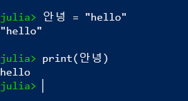 줄리아의 변수명은 알파벳 뿐만 아니라 한글 등의 유니코드 문자들도 사용할 수 있다.