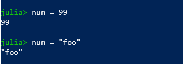 그리고 줄리아의 변수는 값 뿐만 아니라, 타입의 변경도 자유롭다.