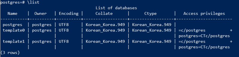 데이터베이스 목록은 \list, 혹은 \l 명령을 사용하여 조회할 수 있다.