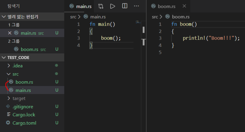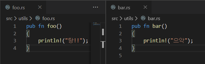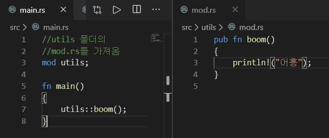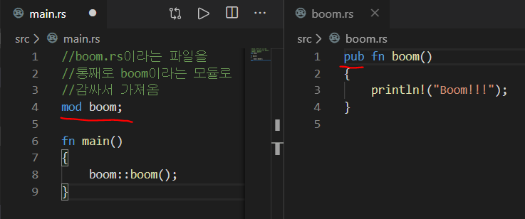 참고로, 다른 모듈에서 사용될 기능은 pub를 달아서 공개를 해줘야한다는 사실. 잊지 말자.