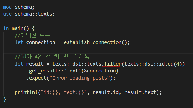 filter에는 조건을 표현할 함수를 인자로 넘겨야 하는데, table!로 생성되는 dsl::속성 필드에 필요한 비교자들이 있어서 그걸 쓰는게 더 편하다.