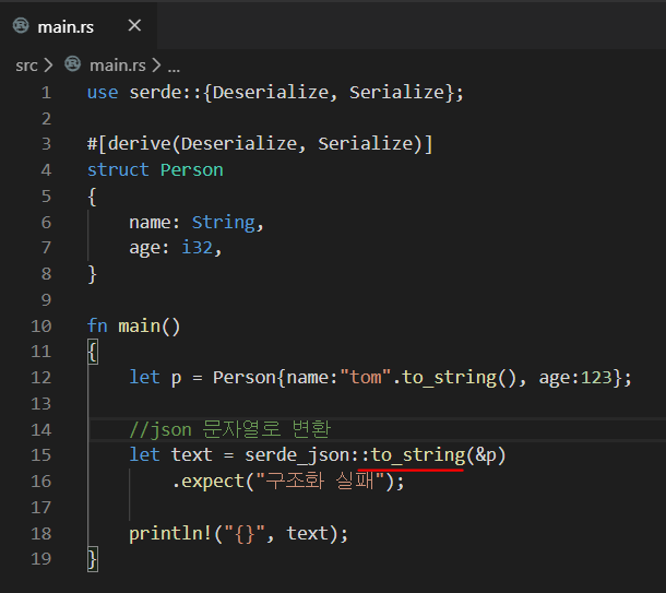 ๊ฐ์ฒด๋ฅผ ๋ง๋ค์ด์ json ํ ์คํธ๋ก ๋ณํํ๋ ๊ฒ๋ ๊ฐ๋จํ๋ค. ๊ทธ๋ฅ serde_json::to_string ๋ฉ์๋์ ์ฐธ์กฐ๋ก ์ ๋ฌํด์ฃผ๋ฉด Result๋ก ๊ฐ์ธ์ ๋ฐํํด์ค๋ค.