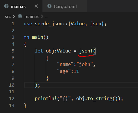 json ๊ฐ์ฒด๋ฅผ ๋ง๋๋ ๊ฐ์ฅ ์์ฌ์ด ๋ฐฉ๋ฒ์ json! ๋งคํฌ๋ก๋ฅผ ์ฌ์ฉํ๋ ๊ฒ์ด๋ค.