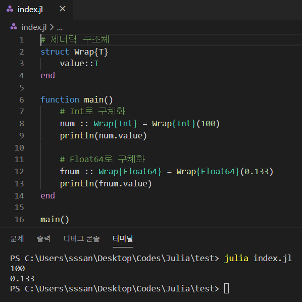 줄리아는 구조체에 대한 제너릭을 제공한다.