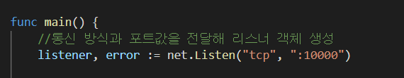 그리고 가장 먼저 해야할건 리스너 객체를 생성하는 것이다. 첫번째 인자로 tcp임을 알리고, 두번째 인자로 서버의 포트값을 써준다.