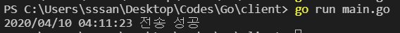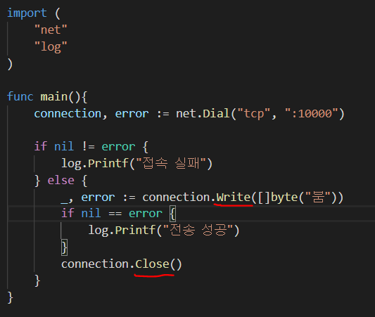 Dial로 연결 객체를 생성, Write 메서드로 서버에 텍스트를 byte열로 전송한다.