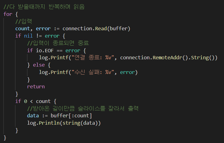 log.Printf("연결 종료: %v", connection.RemoteAddr().String())