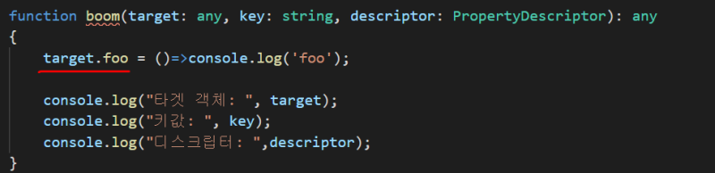 데코레이터의 target은 클래스 정보가 통째로 넘어오는 것이기 때문에, 이걸 사용하면 해당 클래스의 전반을 살펴보거나 마음대로 조작할 수가 있다.