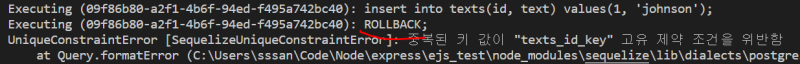 ์ฌํผ ๊ทธ๋๋ก ์คํ์ํค๋ฉด, ์ ๊ธฐ์๋ id 1๊ฐ์ด ์ด์ ๊ณผ ๋์ผํ๊ฒ ๊ณ ์ ํค์ ์ถฉ๋ํ๋ฏ๋ก, ๋กค๋ฐฑ์ด ๋ฐ์ํ๋ค.
