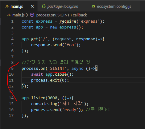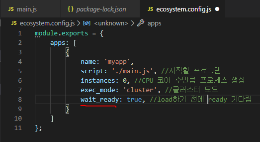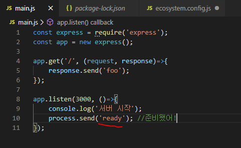 동작이 완료될때 process.send로 ready 메세지를 찍어주면 된다.