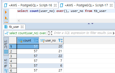 [PostgreSQL] group 없이 count하기: over 함수