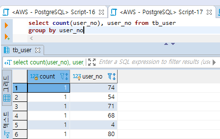 각각의 user_no끼리만 묶어버려서 다 1씩만 반환하고 만다.