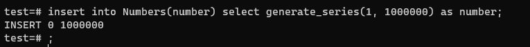 간단한 테이블을 만들고 1000000개의 데이터를 삽입했다.