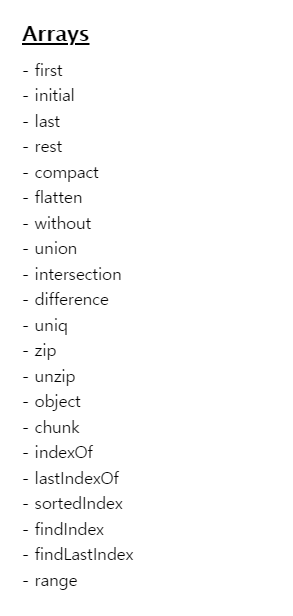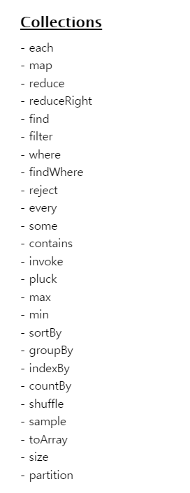 이외에도 기본 라이브러리에 존재하는 map, reduce, filter, find 등등이 구현되어있다.