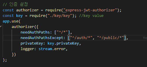 needAuthPathsExcept๋ ์ธ์ฆ์ด ํ์์๋ ๊ฒฝ๋ก์ ์ ๊ทํํ์ ๋ชฉ๋ก์ด๋ค. ์ฐ์ ์์๊ฐ ๋ ๋์์, needAuthPaths์ ํด๋น๋๋๋ผ๋ needAuthPathsExcept์ ํด๋น๋๋ฉด ์ธ์ฆ์ ๊ฑฐ์น์ง ์๋๋ค.