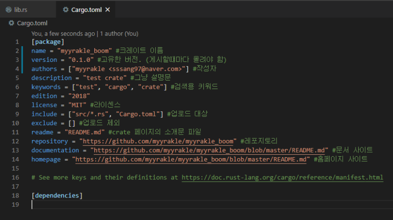여기의 package 목록이 crate 업로드에 필요한 모든 정보가 들어가는 부분이다.