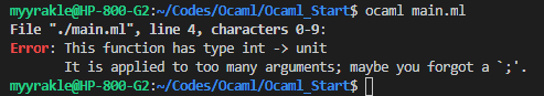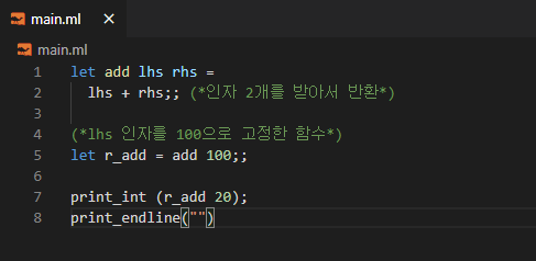 Ocaml๋ ๋ญ ํจ์ํ ์ธ์ด๋ค๊ณผ ๋ง์ฐฌ๊ฐ์ง๋ก ์ปค๋ง์ ํตํ ๋ถ๋ถํจ์์ ์ฌ์ฉ์ด ๊ฐ๋ฅํ๋ค.
