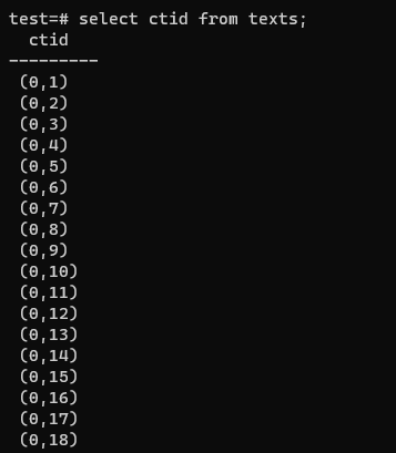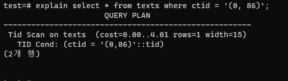 postgresql์ ๋ฐ์ดํฐ์๋ TID๋ผ๋ ๊ณ ์ ํ ์๋ณ๊ฐ์ด ๋ด์ฅ๋์ด์๋ค.