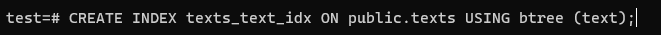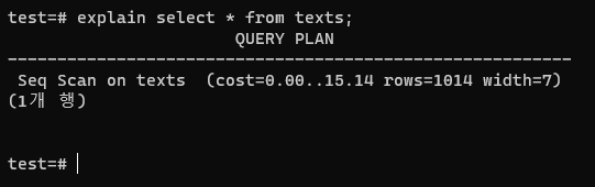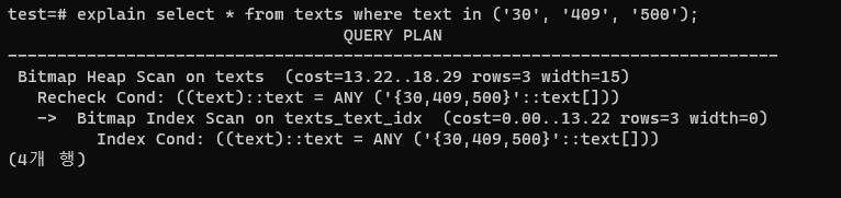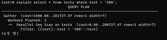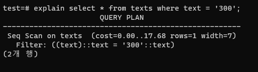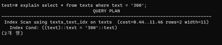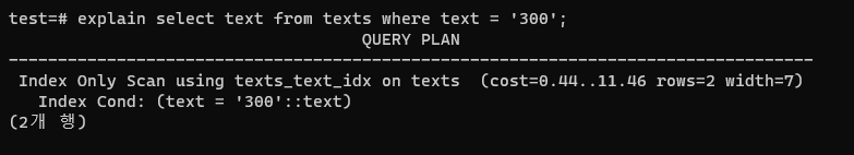 ์๊น๋ select *๋ก ์ธ๋ฑ์ค์ปฌ๋ผ์ด ์๋๊ฒ๊น์ง ๋ค ๊ฐ์ ธ์์ง๋ง, ์ด๋ฒ์๋ ์ธ๋ฑ์ค์ธ text๋ง ๊ฐ์ ธ์๋ค.
