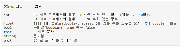 OCaml์ ๊ธฐ๋ณธ ํ์ ์ผ๋ก๋ int, float, bool, char, string, unit์ด ์๋ค.