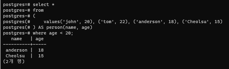 쿼리를 작성하다보면, 임의의 값 리스트들을 테이블 없이 테이블처럼 처리하고 싶을 때가 있다.