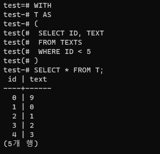 with๋ฌธ์ ์ฟผ๋ฆฌ์ ๊ฒฐ๊ณผ๋ฅผ ์์๋ก ๋ฌถ์ด๋ ์ ์๊ฒ ํด์ฃผ๋ ํธ๋ฆฌํ ๊ธฐ๋ฅ์ด๋ค.
