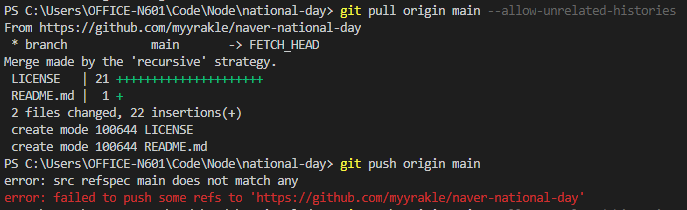 [Git&Github] 최초 업로드시 끝없는 "error: failed to push some refs to" 오류 발생...