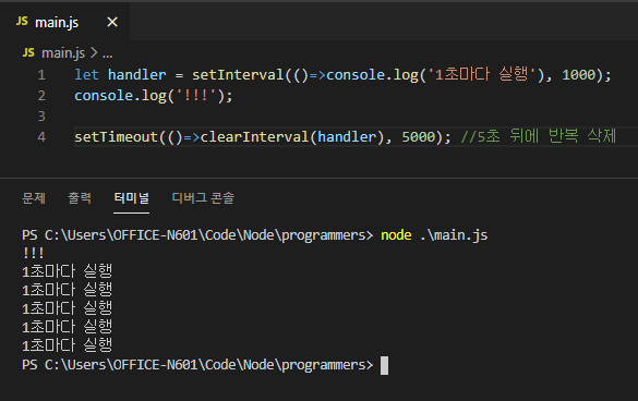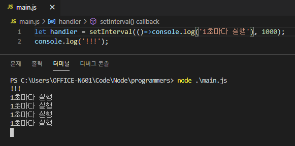 인자 구성은 Timeout과 동일하다. 콜백함수와 주기로 설정할 밀리초 단위 시간값을 받는다.