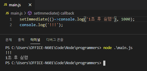 setImmediate는 언뜻보면 setTimeout과 유사한 함수다.