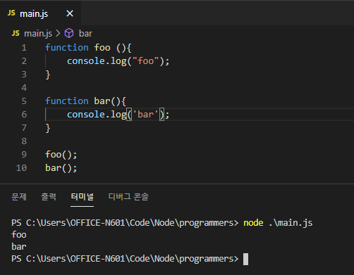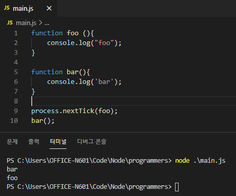그래서 원래 이런 코드는 당연히. foo 함수와 bar 함수가 순서대로 실행된다.