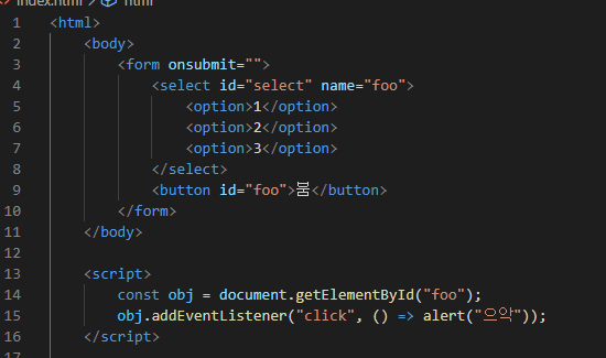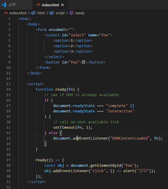 저 코드에서 foo라는 id를 가진 요소를 가져와야 거기다가 이벤트를 등록하는 건데.
