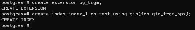 create extension์ผ๋ก ๋จผ์ pg_trgm ํ์ฅ์ ํ์ฑํํ๊ณ , ์ธ๋ฑ์ค ์์ฑ์์ ์ฐ์ฐ์ ํด๋์ค gin_trgm_ops๋ฅผ ๋ถ์ฌ์ฃผ๋ฉด ๋๋ค.