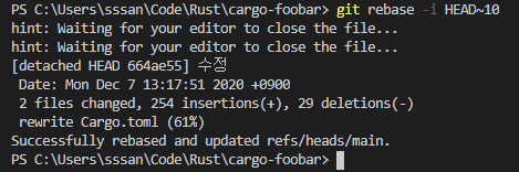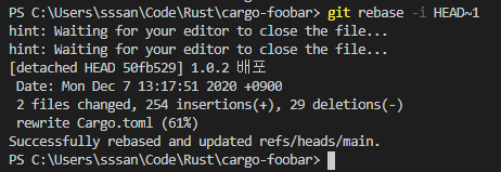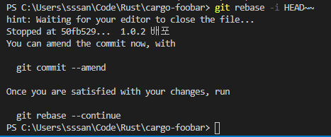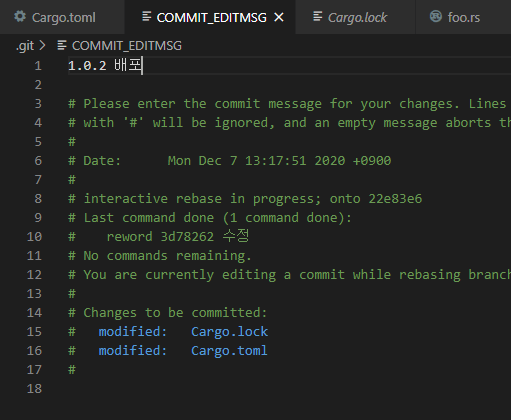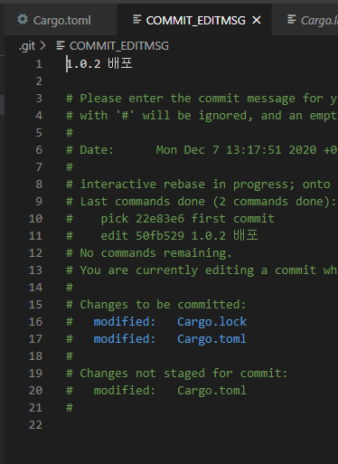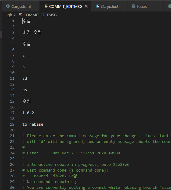 그럼 커밋 메세지 등은 유지된 채로 작업내용만 바뀌어있을 것이다.