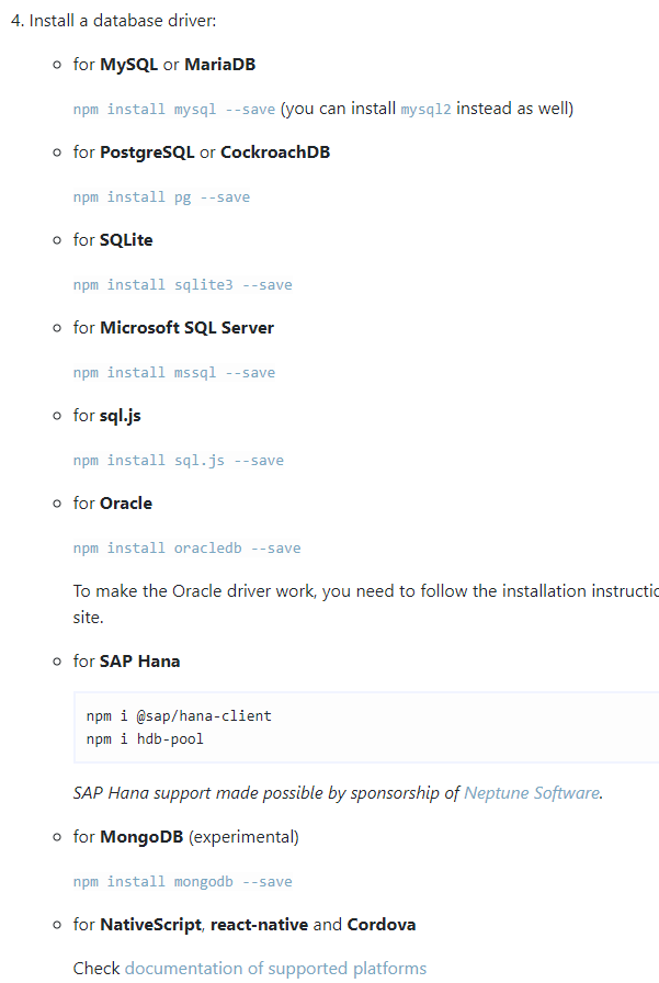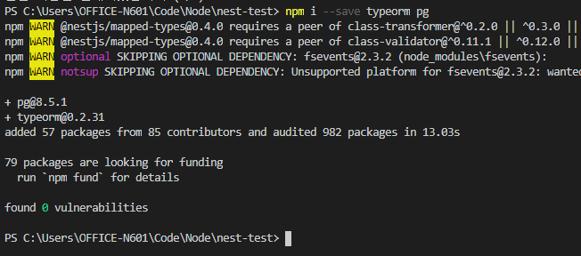typeorm ๋ชจ๋๊ณผ ์ฌ์ฉํ DB ๋ชจ๋์ ์ค์นํ๋ค.
