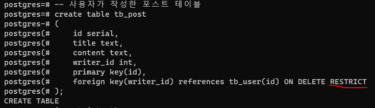 restrict๋ ๊ทธ๋ญ tb_user์ ์ญ์ ๋ฅผ ๋ง๋ ๊ฒ์ด๋ค.